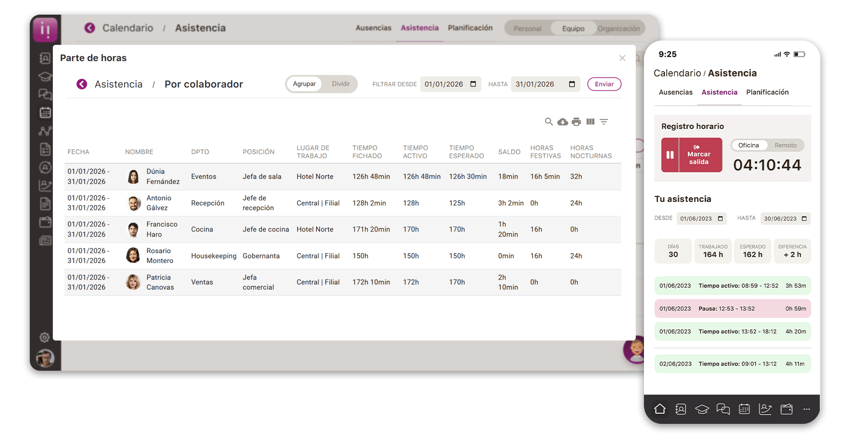 Simplifica el control horario de tu hotel. Donde sea que estés, elige entre ordenador, app o tablet para fichar. ¡Y eso no es todo! Contamos con reconocimiento facial para un fichaje rápido, fiable y seguro.